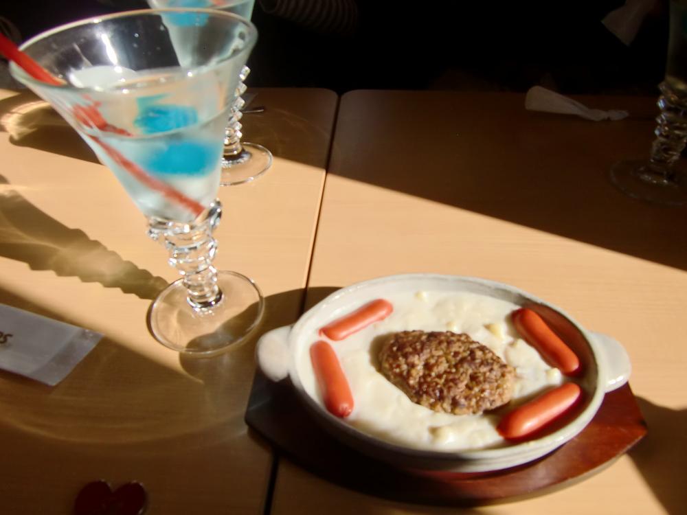 ブルーウォーターは炭酸水にブルーハワイのゼリーが浮かんだような、そんな感じで、グラタンは見ての通り。コクピットがハンバーグで、マジックハンドが赤ウィンナー。ブルーウォーターのゼリーがもったいなくて、みんなちびちび飲んでました。